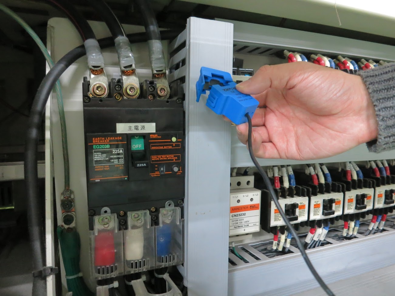 産業機械の多くは、機械の一部が配電盤になっており、簡単にアクセスできます。 ここの計測したい線に、クランプ状のセンサを取り付けます。