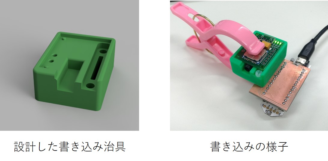 書き込みは、自作の治具で行います。3Dプリンタとポゴピンで作りました。