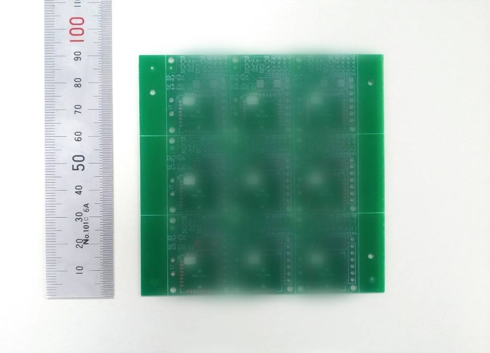 設計した量産基板です。面付けして、フィデューシャルマークや捨て板をつけました。捨て板には製造用に穴が必要です。量産設計は初めてだったので、こうした仕様は実装業者の方に教えて頂きながら、形にすることができました。