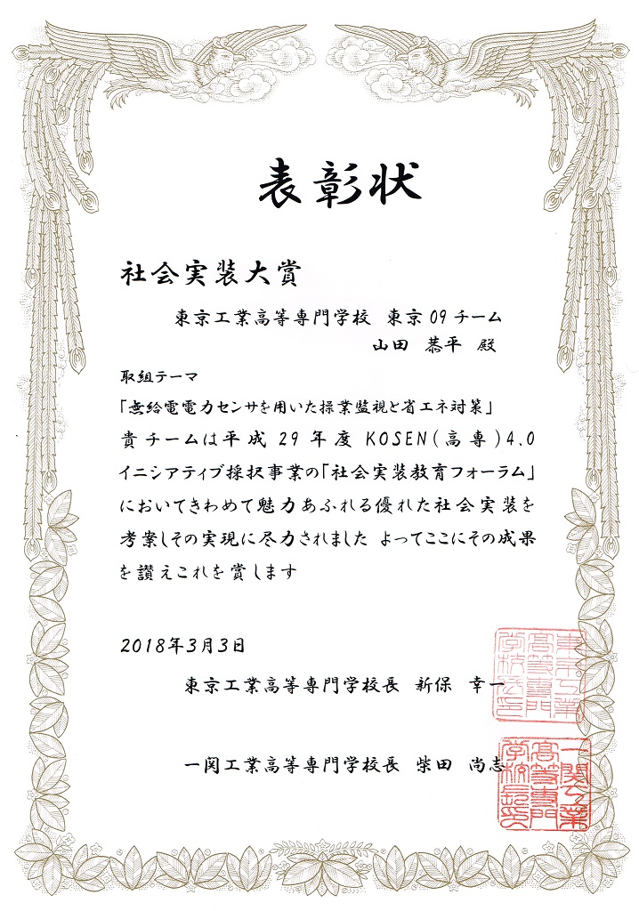 また、「IoTを活用した学校環境可視化システムの開発」は、社会実装賞(構想)を受賞しました。 このテーマは、後輩の方々が私の設計開発したガスにゃんを用いてシステムを構築し、実験してくださったものです。